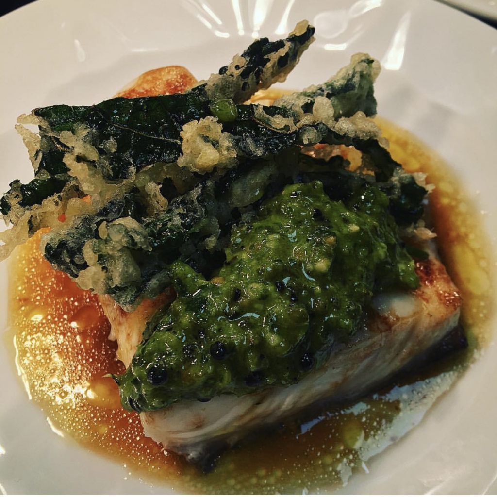Wild Alaska Halibut, Baked in Beef and Onion Butter, Crispy Cavolo, Ramson Caper Pesto by Adam Reid