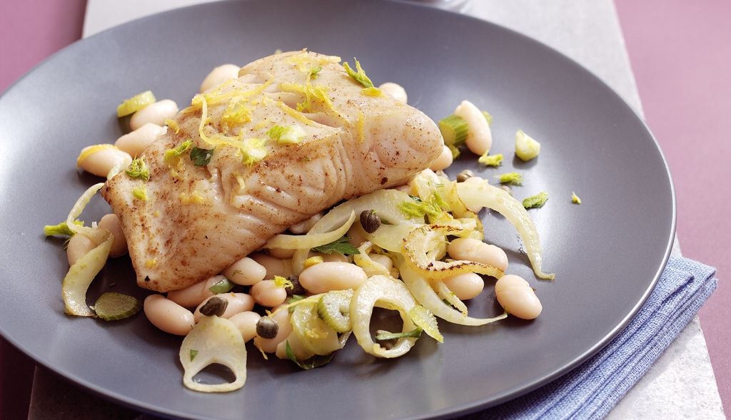 Roast Wild Alaska Halibut with Fennel and Cannellini Beans