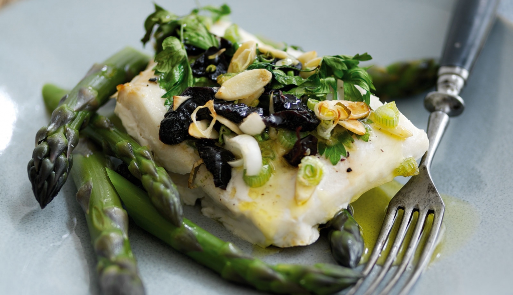 Prune, Almond and Parsley Topped Roast Wild Alaska Halibut