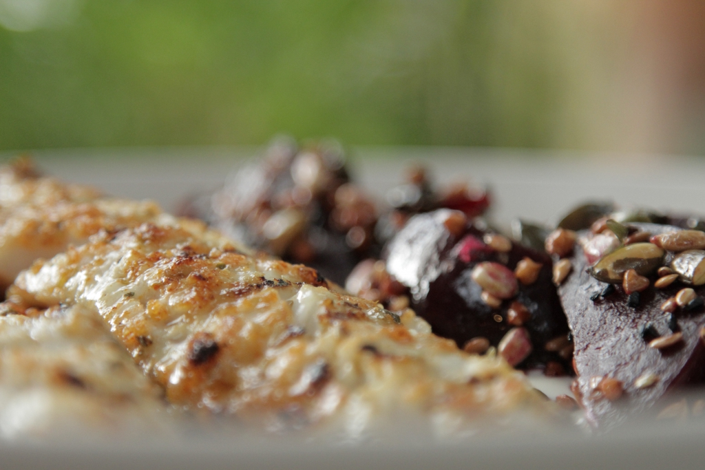 Southern Rub Pollock Fillets, BBQ Hot Baked Beetroot, Sunflower Seed and Yogurt Salad by Alyn Williams