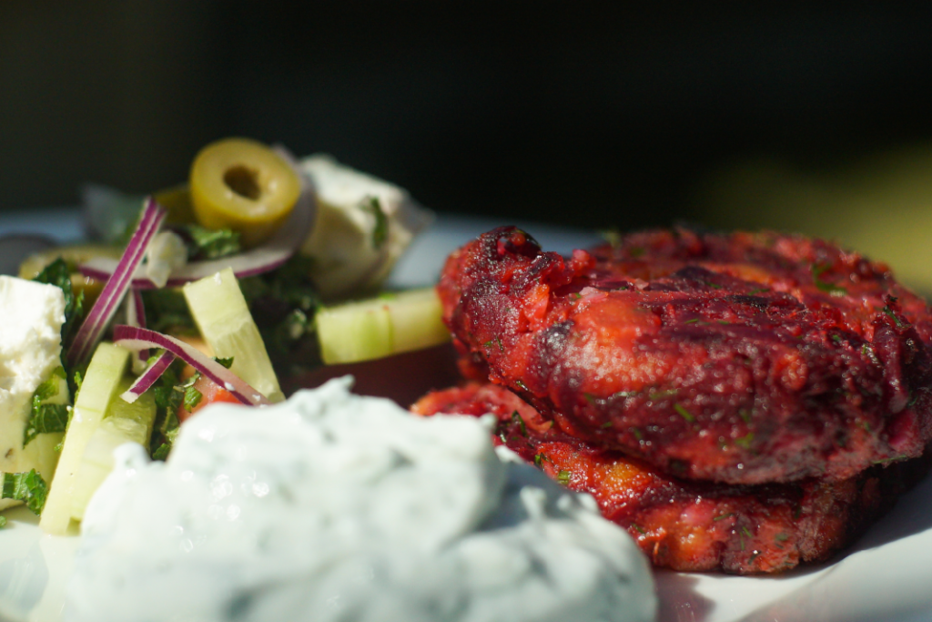 Alaska Pollock and Sweet Potato and Beetroot Fishcakes with Lemon Yoghurt and Greek Salad