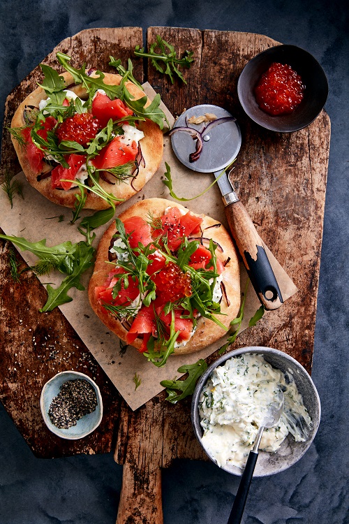 Pizzetta Bianco with Alaska Smoked Salmon, Herb Crème Fraîche, Red Onion, Rocket and Keta Salmon Roe