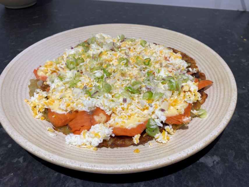 Rosti Potato with Smoked Alaska Salmon, Grated Eggs and Horseradish Emulsion by Adam Reid