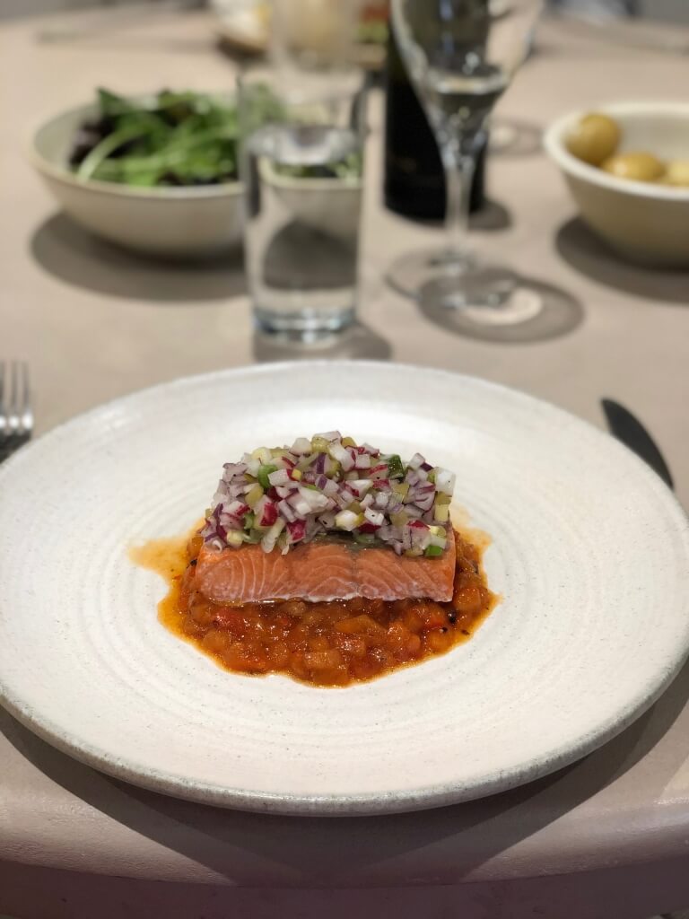 Grilled Wild Alaska Salmon with Pickled Peppers, Radish and Onions by Adam Reid