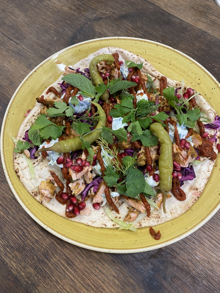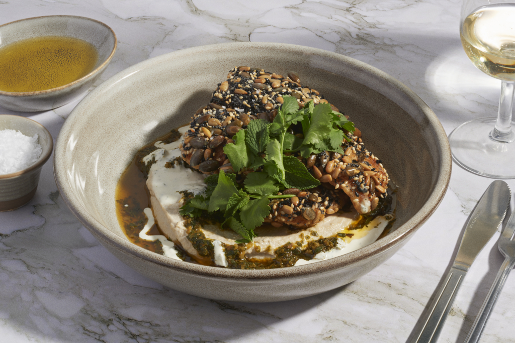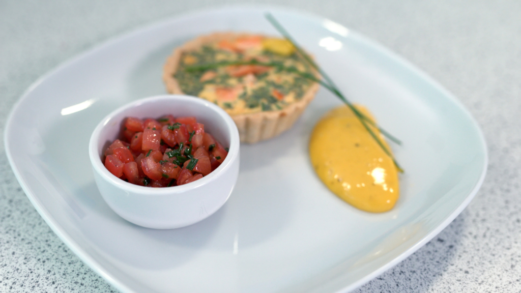 Wild Alaska pink salmon and tarragon tart, tomato concasse and chive salad, served with rapeseed oil mayonnaise
