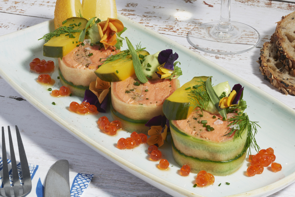 Poached Alaska Sockeye and Smoked Keta Salmon & Cucumber Roulade